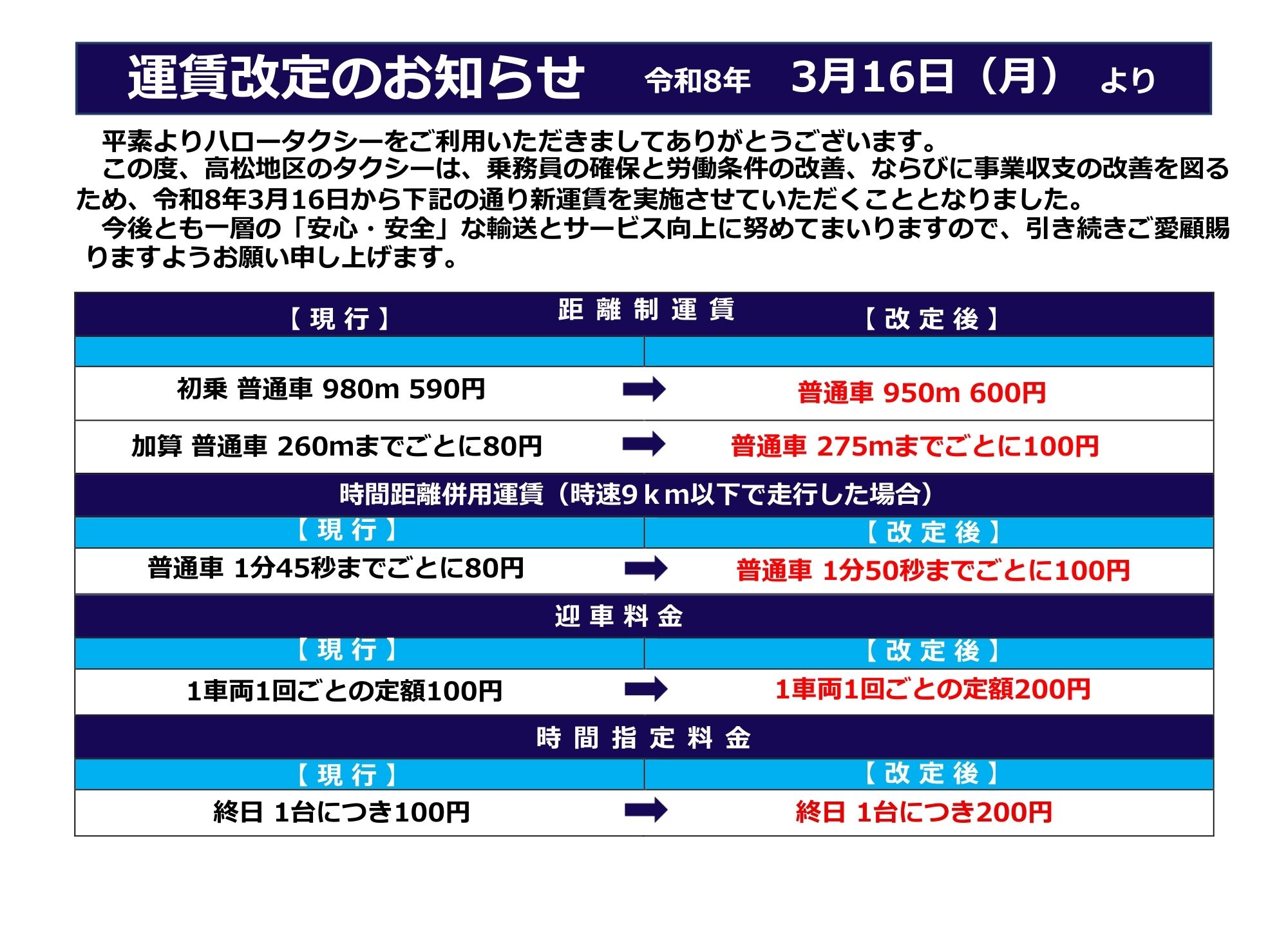 お客様には多大なご負担をおかけすることとなりますが、今回の運賃改定により乗務員の労働条件の改善を図り、今後とも一層の「安心・安全」な輸送と質の高いサービスを提供できるよう努めてまいりますので、引き続きご愛顧賜りますよう何卒お願い申し上げます。